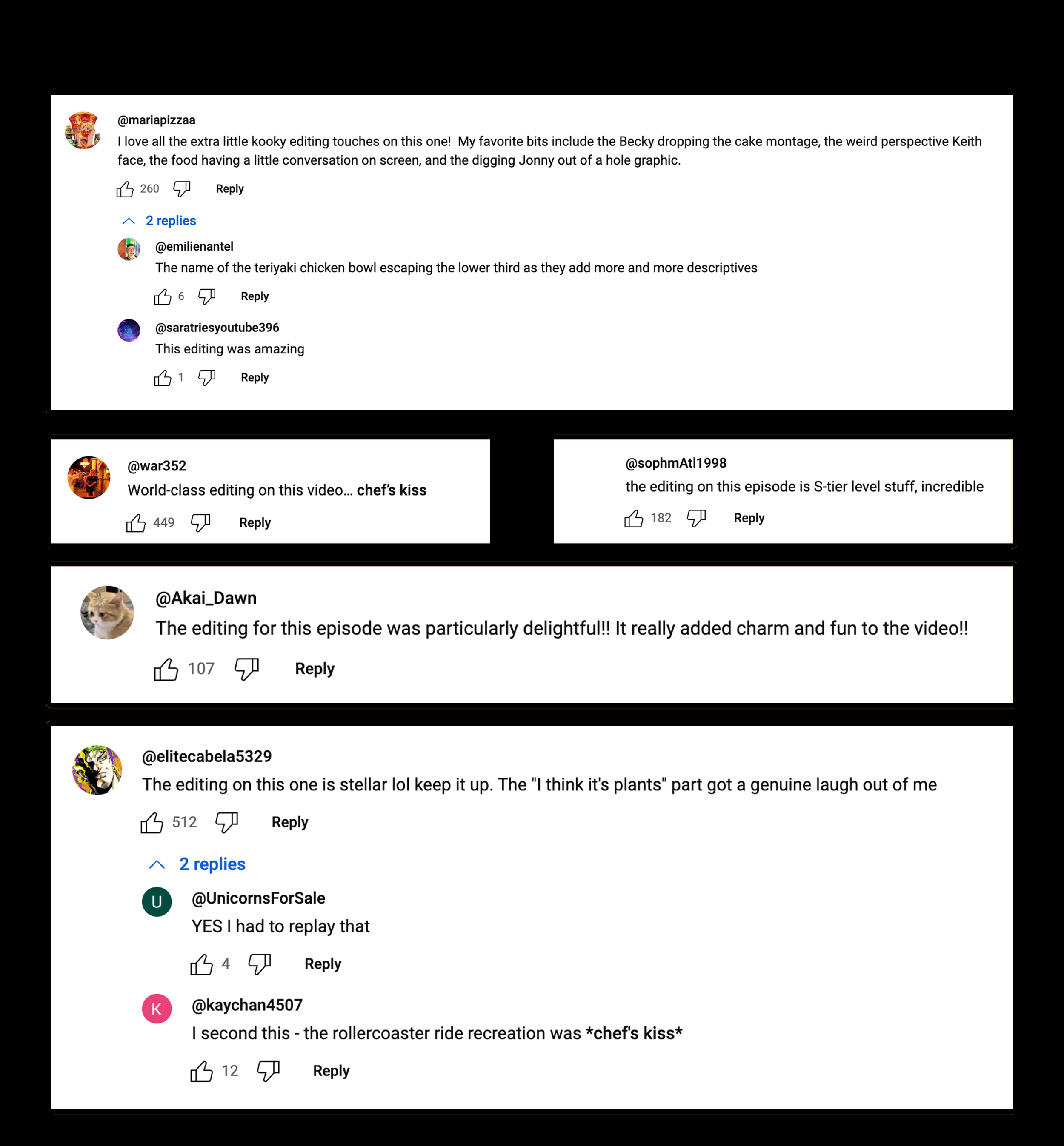 I’ve had the privilege of editing several videos for YouTube superstars the Try Guys, including episodes from their most popular series: Eat the Menu, the largest food review show on the internet, and Without a Recipe, their flagship series. The response to my editing style from their audience has been overwhelmingly positive, and I continue to approach each project with enthusiasm and a sense of curiosity.